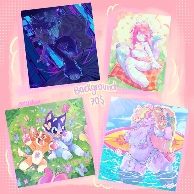 ₊˚ෆ any type of background of your choice, from landscapes to indoors.♡⸝⸝ must send reference images and give a clear explanation on theme, color palette and others.♡⸝⸝ any aditional characters will be from 15$ - 35$